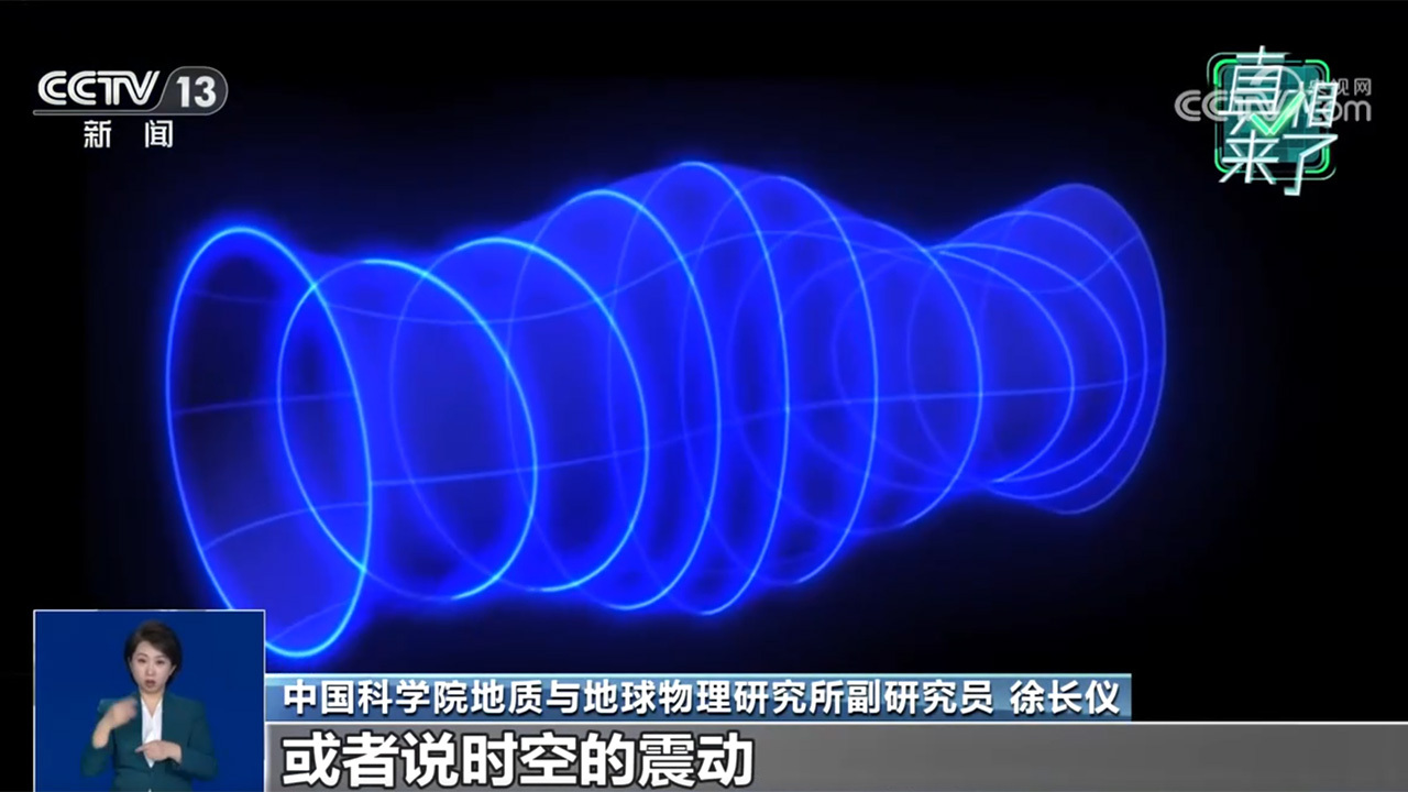中国科学院地质与地球物理研究所副研究员 徐长仪:按照爱因斯坦的广义相对论的话,引力波其实是时空曲率的扰动,以波动的形式,从辐射源向外传播的一种物理现象。就像水面上的涟漪一样,大家喜欢称它为“时空的涟漪”或者说时空的震动。