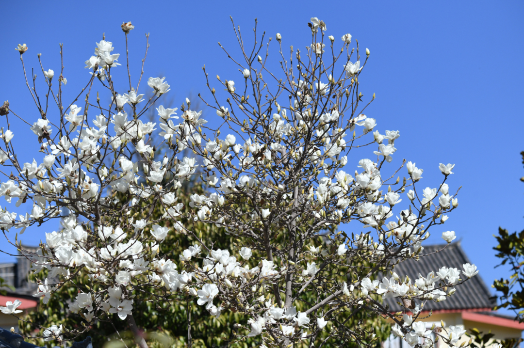 据悉,玉兰花又称白玉兰、望春花,其特点是先开花后长叶,花瓣多为白色或紫色,盛开时散发着淡淡的清香,花期一般有20天左右。(丽江融媒记者 赵庆祖)