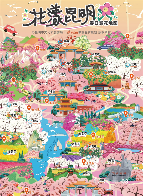 赏花之余,无论是花海旁的小吃咖啡、林间登山的惬意邂逅,还是环湖骑行的亲子时光、温泉相伴的养生休闲,都让这场新春花事更具烟火气息与人情暖意。南屏步行街、金马碧鸡坊等城市打卡点的主题花艺点缀,让市民游客在漫步途中,随时能与新春的美好与惊喜不期而遇。