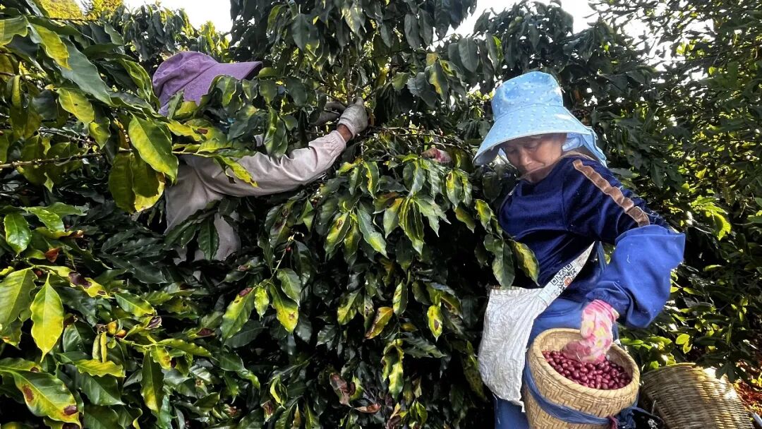 张九花(右)在采摘咖啡鲜果。农民日报全媒体记者郜晋亮 摄