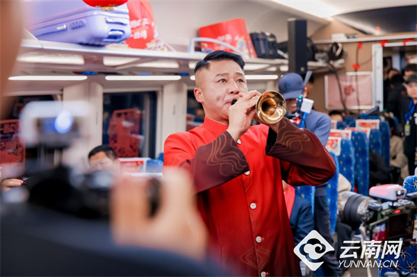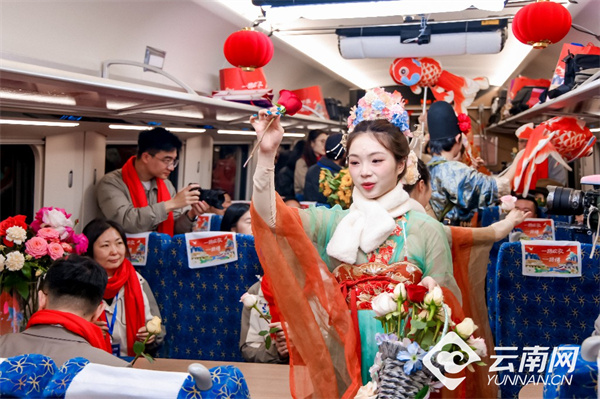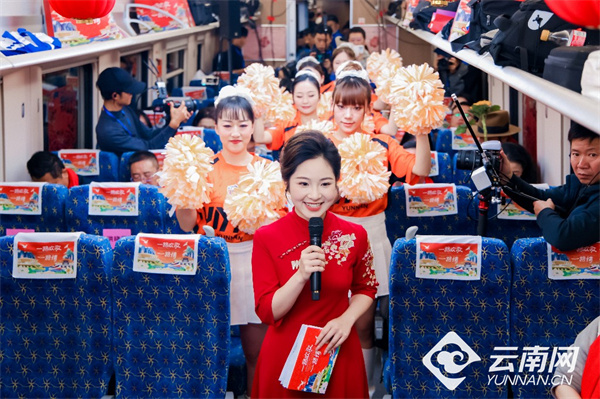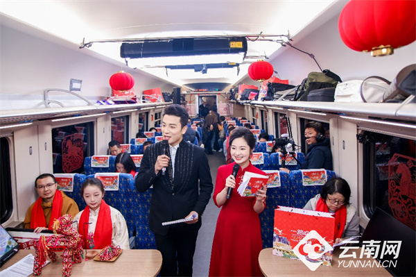 在4个多小时的行程中,来自中老两国的艺术团体与各界代表共迎新春、共叙友谊。活动安排了文艺展演、民俗体验、故事分享等50余个环节,《放马山歌》《花鼓·花鼓》《Fun傣》等节目极具云南特色,新派花灯剧《铁路情·文明行》,云南方言说唱《云南DNA》,唢呐独奏《百鸟朝凤》让人眼前一亮;阿尼么乡村好歌汇,昆明打歌队,南涧彝族跳菜队,滇超足球宝贝带来各自的精彩演出,也有老挝艺术家在老挝车厢带来《一带一路》《一路生花》《中老友谊》等融合两国文化元素的节目,车厢内掌声不断、欢声笑语。
