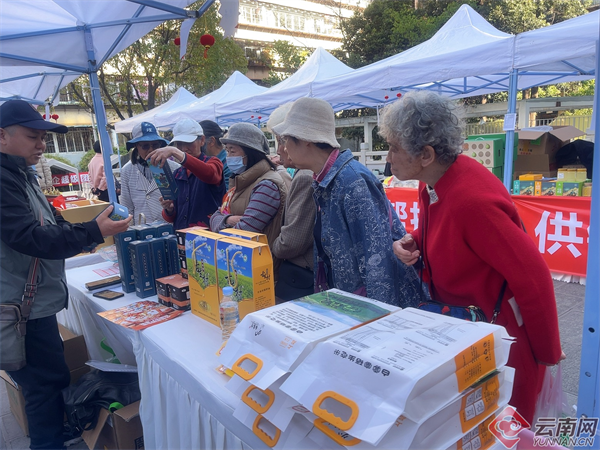 2月4日,云南省供销合作社在机关大院举行“‘供销市集’进机关、农品飘香贺新春”展销活动。