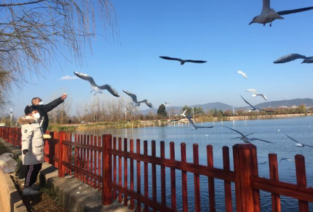 杞麓南岸人鸥同乐。 通讯员 朱雁飞 摄