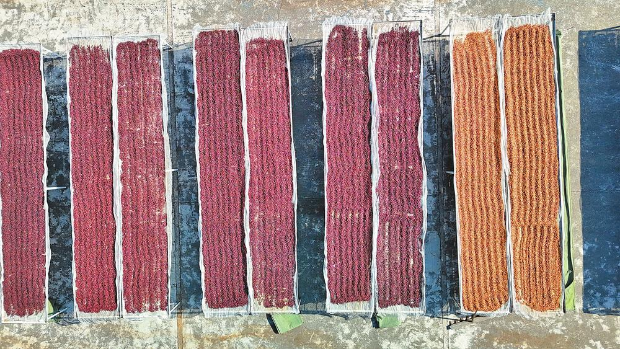 晾晒咖啡豆。