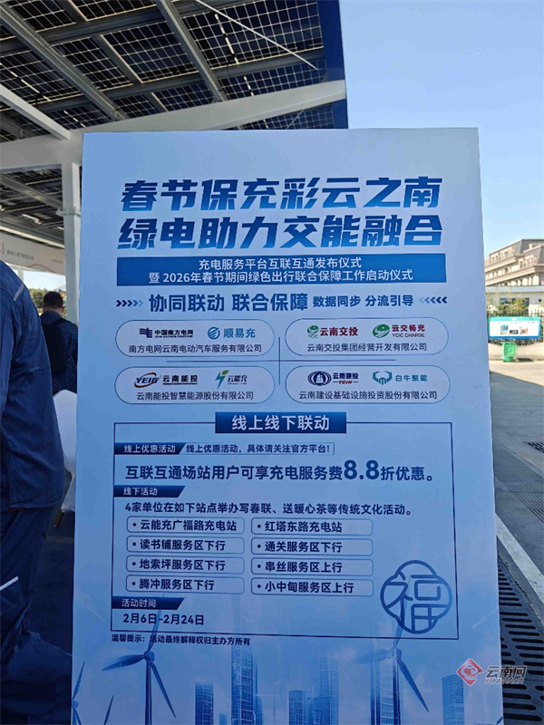 “以互联互通为契机,我们同步启动了春节期间电动出行保障行动。”云南电动汽车公司党支部书记董事长张苏介绍,各方将紧扣春节出行高峰场景,通过优化服务流程、强化应急处置与分流引导,全方位破解电动车主“充电难、调度乱、顾虑多”的痛点,切实提升充电服务的可得性、便利性与稳定性,让广大电动车主返乡团圆、出游出行更安心。