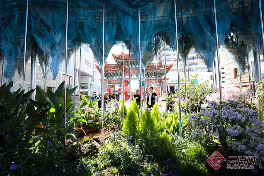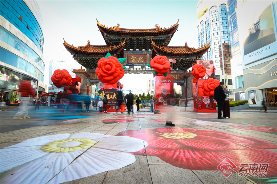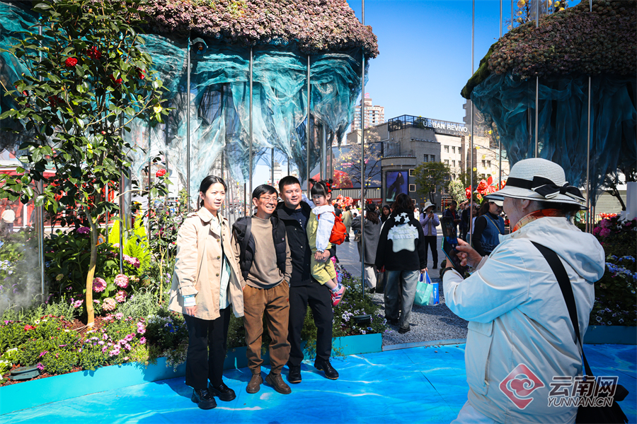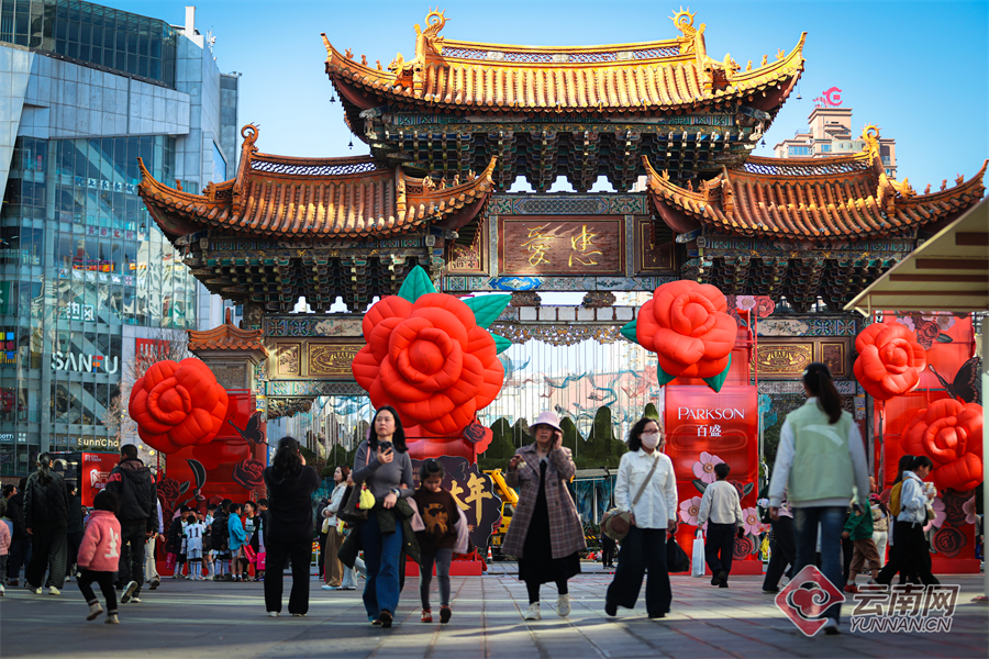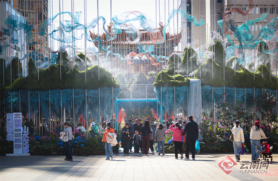 2月11日,昆明市南屏街广场迎来一座近9.9米高的巨型花雕作品,该花雕以“山水城市”为灵感,三层山峰叠翠、碧水环绕,现场水雾缭绕,营造出一幅立体流动的生态画卷,吸引众多市民驻足留影。与此同时,南屏街全线以昆明市花山茶花及大众喜爱的月季元素点缀,整条街区化身明媚的“春日花园”,让市民在繁华商圈感受“推窗见绿、行路见花”的春城年味。