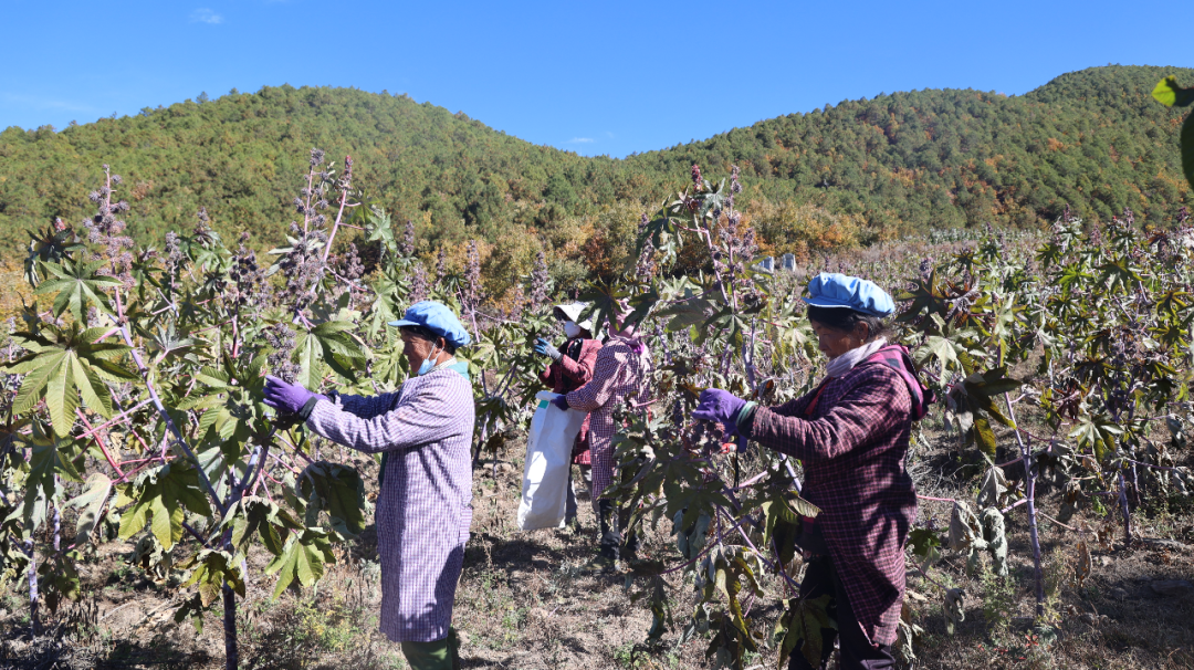 村民们既能在蓖麻基地务工赚钱