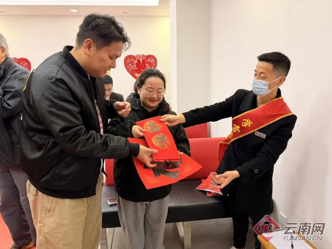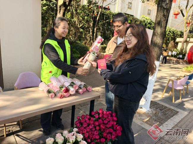 云南网讯(记者 牟燕红)2月14日,新春将至,云南省昆明市五华区民政局婚姻登记处洋溢着温馨喜庆的氛围。当天婚姻登记迎来新春前后小高峰,全区共办理结婚登记140对,其中五一路婚姻登记点办理70对。为让新人领证更有仪式感、幸福感与安全感,五华区委组织部、区民政局、区政务服务管理局、大观街道三合营社区联动发力,推出免费拍纪念照、新春送春联、义务婚前辅导、爱心赠玫瑰等系列暖心服务,用温情与诚意见证幸福时刻。