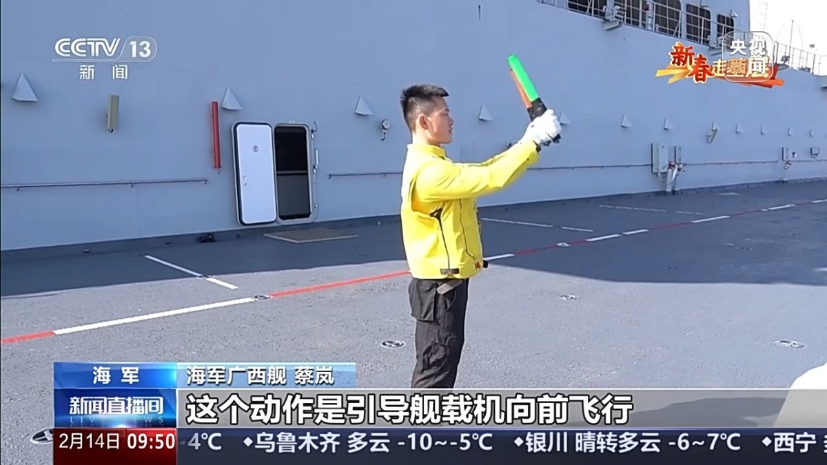 蔡岚:我们手上的是指挥灯棒,红色是代表待命、绿色是代表允许起降,这个动作是引导舰载机向前飞行,这个动作是允许舰载机降落。这两个动作是解系留和撤轮挡,是舰载机起降前,解除舰载机与甲板的固定装置。这个动作是拔除舰载机的电缆,实际起飞前要实施的动作。
