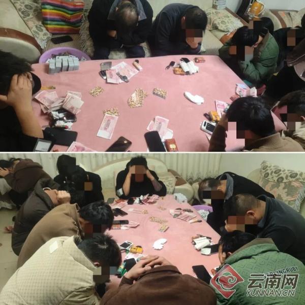 近日,昆明市寻甸县公安局特巡警大队在工作中获悉,辖区一民房内有人聚众赌博。经摸排侦查,民警在充分掌握该赌博窝点情况后快速出击,一举抓获以“捞腌菜”方式进行赌博的12名参赌人员,及一名涉嫌开设赌场人员,查获赌资、赌具若干。