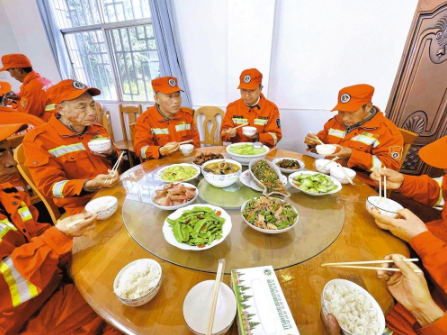 厨房里飘出的饭菜香驱散了林区的清冷,一张简易的桌子旁,十几号人挤得满满当当。香喷喷的火腿、翠绿的豆角……这些平日里简单的食材,此刻因“团圆”二字,显得格外有滋有味。“来来来,多吃点!吃饱了才有力气守好这片林子。”队长招呼着,自己也夹了一大块肉。