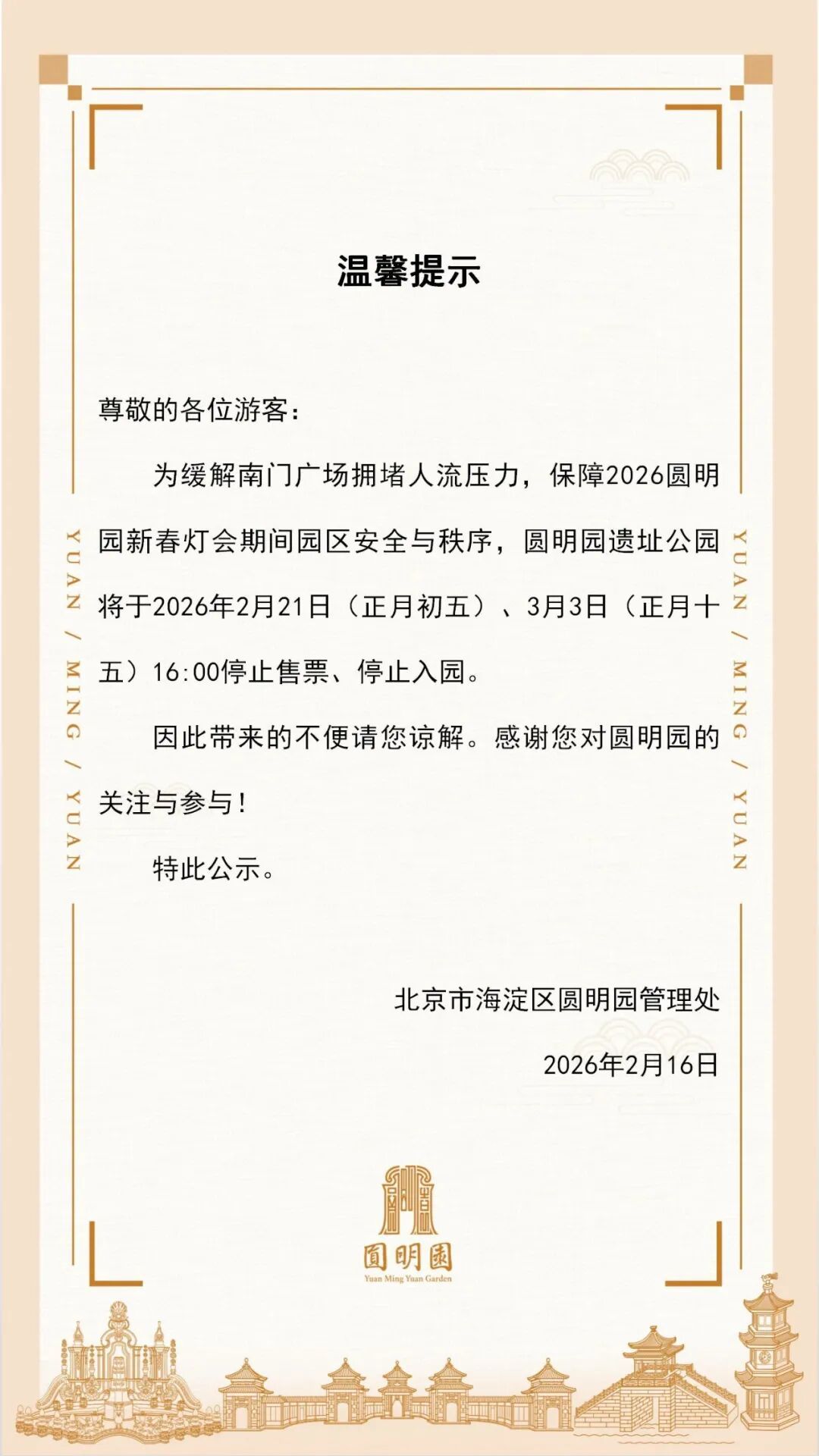原标题:圆明园遗址公园正月初五、正月十五16时停止售票、入园