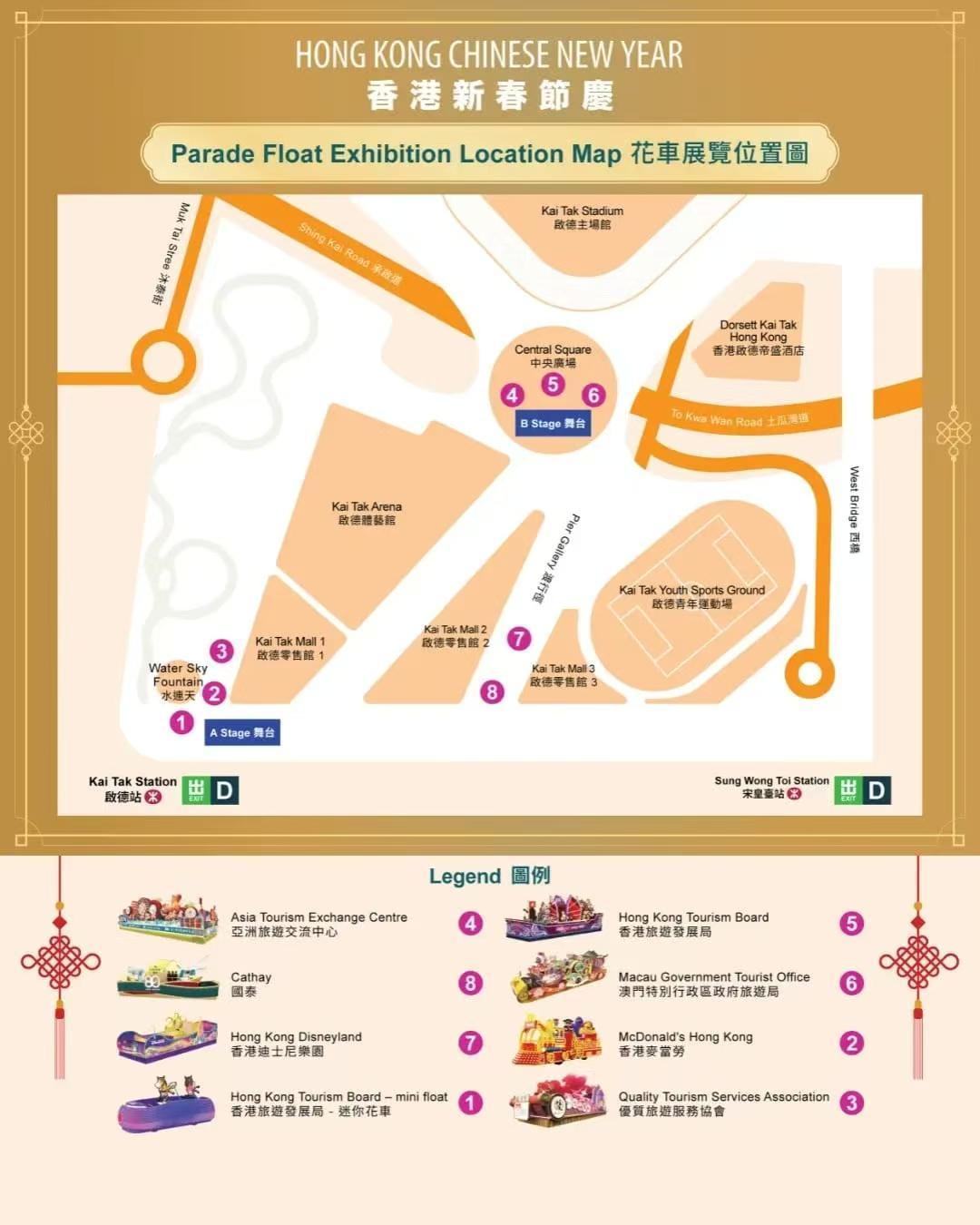 由年初二至年初十(2月18日至26日),市民及旅客可于启德体育园内三大指定位置,包括水连天、中央广场及渡行径,近距离欣赏8辆特色花车,品味每一处创意巧思与工艺细节。入夜后花车亮灯,流光溢彩,打卡位全面升级,日夜各有不同风景。