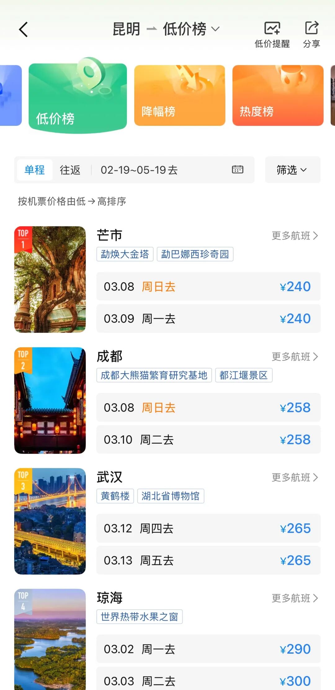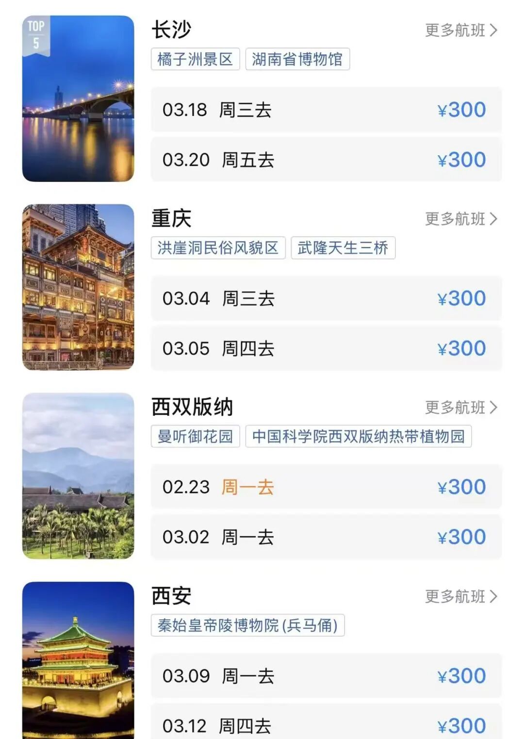 小编在线上订票平台上搜索发现,春节后从昆明出发,前往芒市、成都、武汉、长沙、重庆、西安等热门旅游地的机票都在300元左右,比乘坐高铁的价格更便宜。