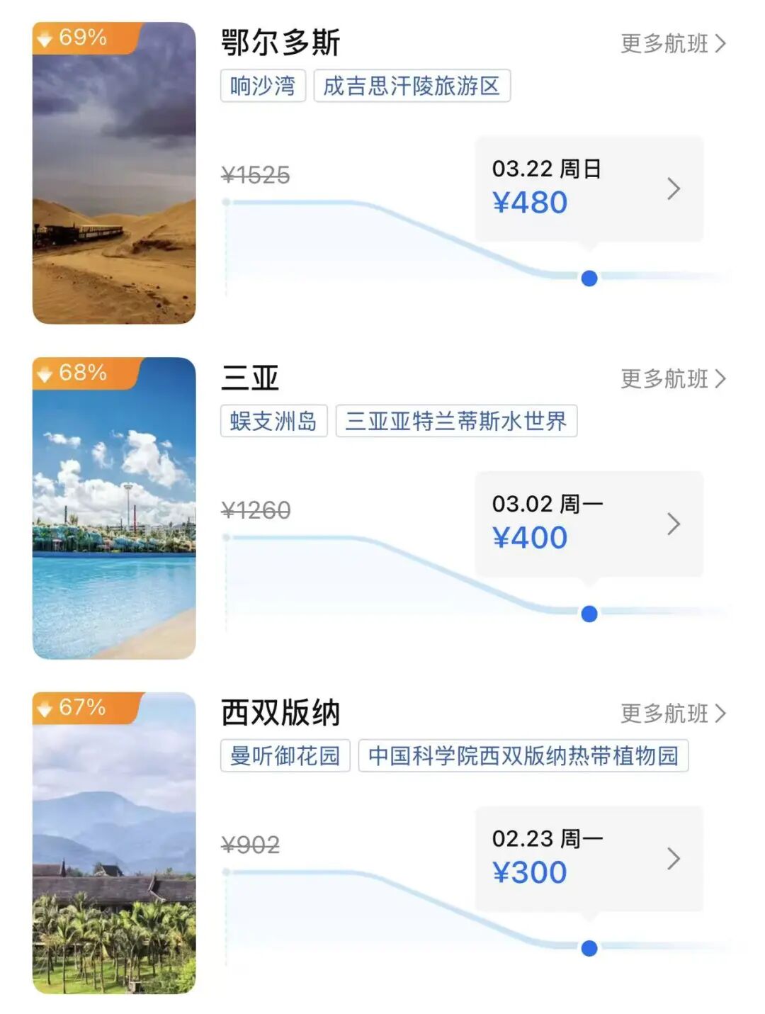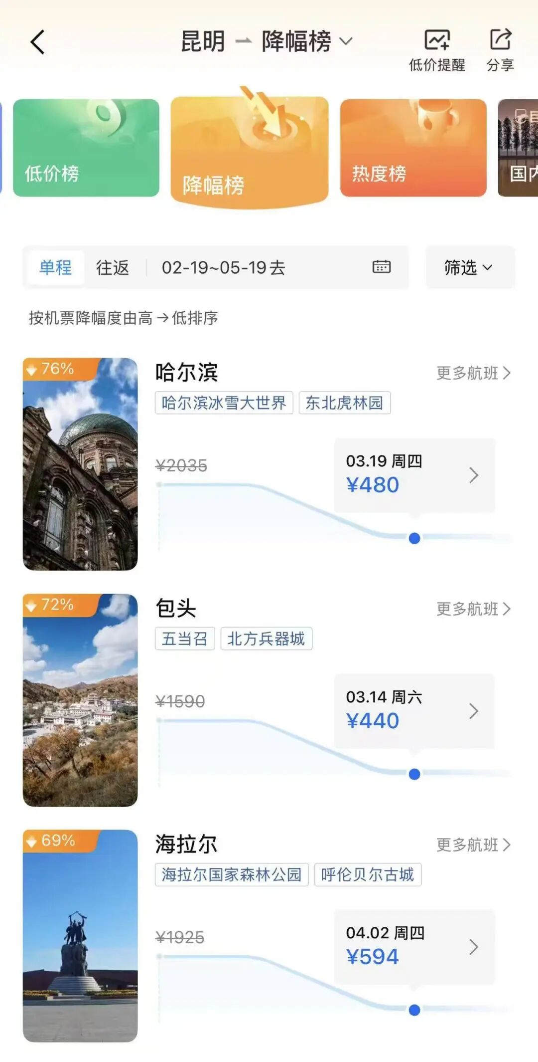 相比于春节前的机票价格,节后从昆明飞往哈尔滨、包头、海拉尔、鄂尔多斯、三亚、西双版纳等地的机票价格下降了70%以上。