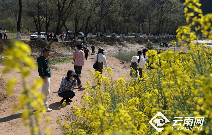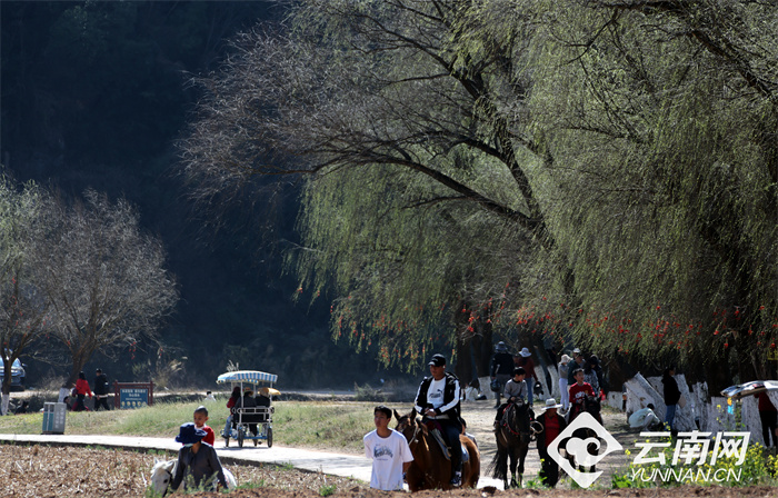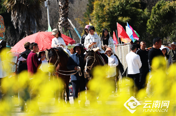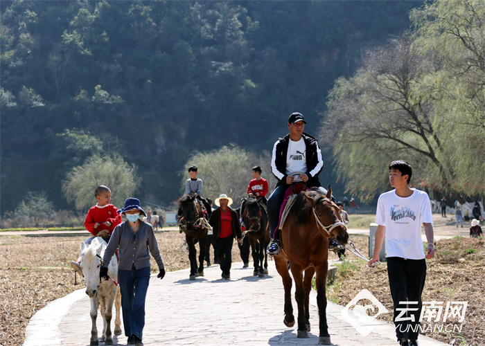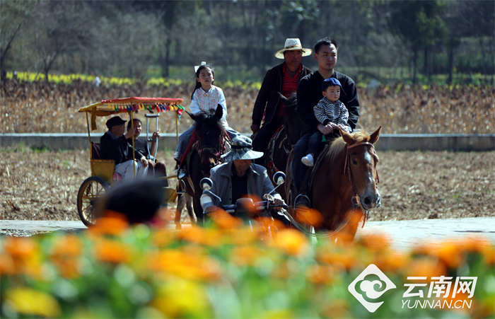 春节假期,市民游客在云南安宁螳螂川踏春赏花,游客骑马漫游田野,尽享惬意田园时光。