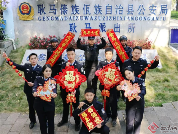 边境一线的“马字号”派出所更是坚守戍边,红河金平马鞍底、绿春骑马坝,普洱孟连勐马,德宏盈江昔马,怒江福贡鹿马登、泸水片马等边境派出所,民辅警以界碑为志、以边境为家,在巡边守卡中送上新春祝福;丽江宁蒗跑马坪派出所还为彝乡群众送上“紫玛格尼”的彝族语新春祝愿,让祝福更具民族温度。