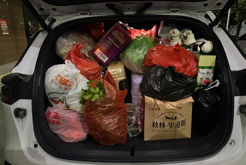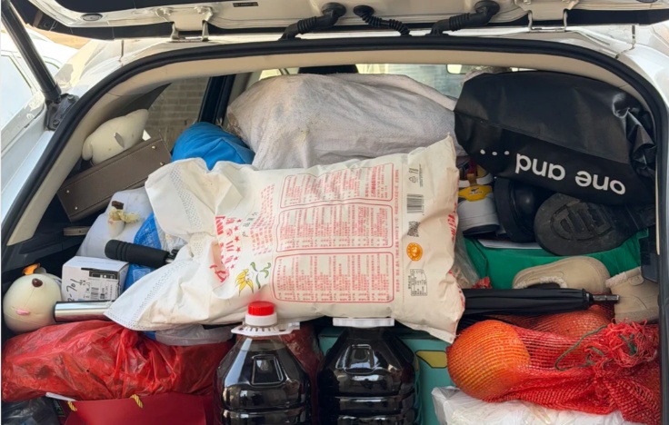 谁懂啊!后备箱一打开,全是爸妈塞的“爱意超载”,各种袋子装的干货、零食……甚至连雨伞、鞋子都给备上了,生怕我在外面吃不好、用不好。——网友@宋大雷