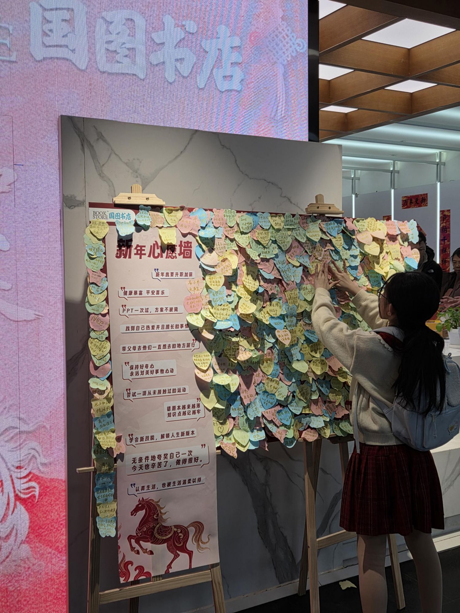 一旁的国图书店新年心愿墙上,也贴满了写满心愿的便利贴:“新的一年想去云南旅游”“考上理想的学校”“家人健康平安”等,满载新春新期许。正在备考的小李贴上了写有“成功上岸”的便利贴,她告诉记者,写下这个便利贴是为了激励自己,她希望能通过努力考上心仪的学校,继续深造。