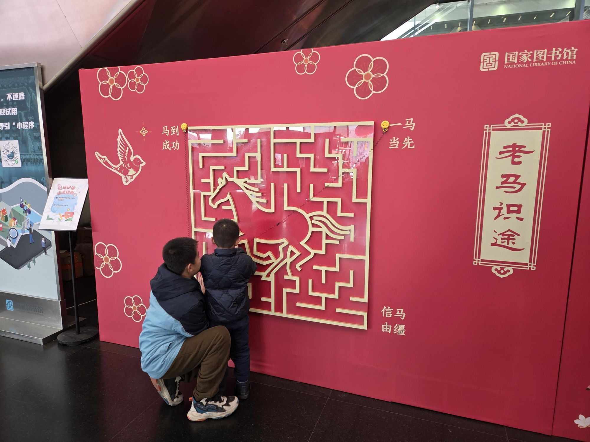 走进国家图书馆总馆北区二层,大厅里多处与马年相关的新春主题互动装置吸引了不少大小读者。一个小男孩在“老马识途”游戏装置前玩了半天,终于用磁吸笔吸引钢珠走出了迷宫;家长领着小朋友在带有生肖“马”的专属相框打卡点拍照,定格美好瞬间;手工体验区的活动从初一到初七每天都不重样,剪纸、装饰画、扭扭棒等都可以体验,还能盖到印章。