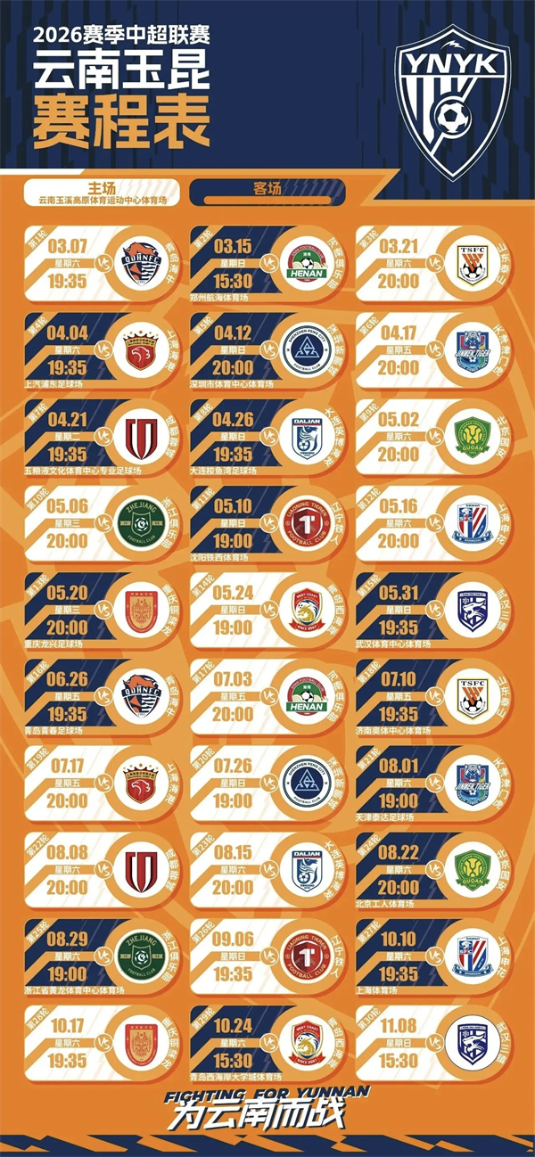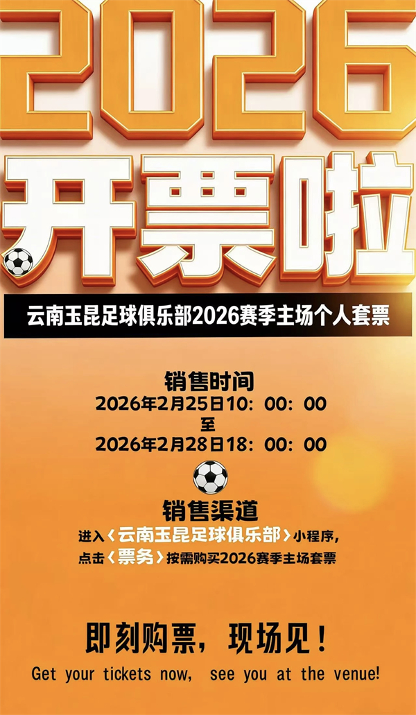 云南网讯(记者 龙彦)日前,记者从云南玉昆足球俱乐部获悉,2026年怡宝中超联赛将于3月火热开启。云南玉昆将在3月7日主场迎战青岛海牛,为广大球迷带来本赛季的首场比赛。目前,云南玉昆足球俱乐部2026赛季主场赛事个人套票售卖已正式开启,将持续至2月28日18:00,广大球迷可根据赛程进行订购。