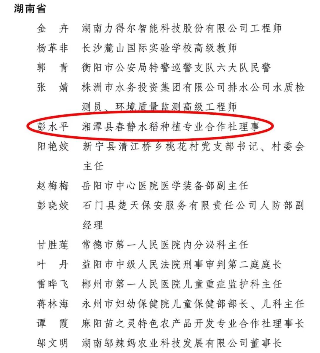 彭水平,湘潭县春静水稻种植专业合作社理事,湖南省第十三届、十四届人大代表,荣获“全国巾帼建功标兵”“全国劳动模范”等多项荣誉。2010年,她放弃职校副校长职务扎根农村,带领乡亲共富。