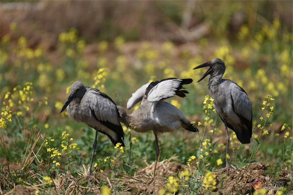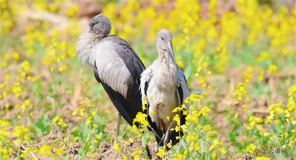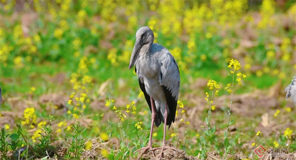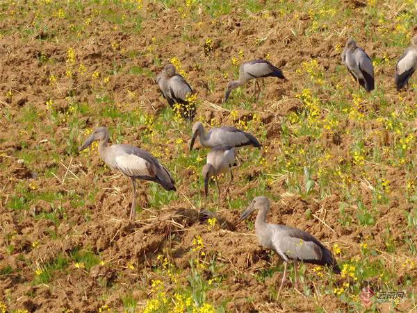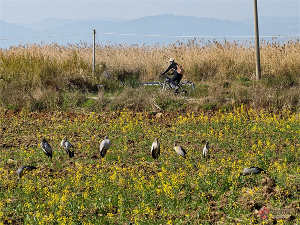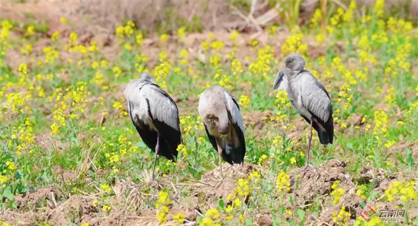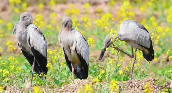 近日,昆明市官渡区福保半岛的油菜花田迎来了一群罕见的“客人”。观鸟爱好者在此记录到国家“三有”保护鸟类——钳嘴鹳的身影。春光烂漫,金浪翻涌,成群的钳嘴鹳悠然漫步花间觅食,与波光潋滟的滇池相映成趣,成为人与自然和谐共处的生动写照。