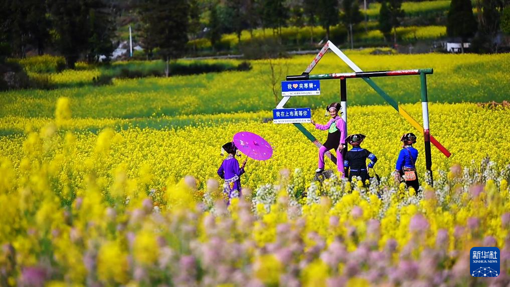 油菜花田五彩斑斓,别具风情,宛如大自然执笔绘就的一幅绝美乡村油画。当地群众和游客纷至沓来,徜徉花海。
