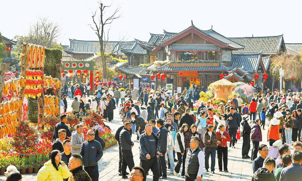 今年春节期间,丽江古城游人如织。 记者 陈飞 摄