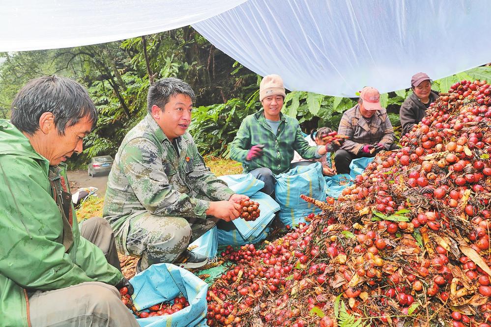 集团驻福贡县拉马底村工作队队员与村民一同采收草果。记者 杨峥 陈飞 摄