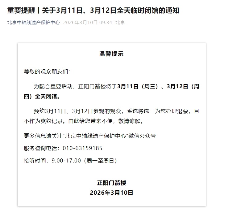 据北京中轴线遗产保护中心消息,为配合重要活动,正阳门箭楼将于3月11日(周三)、3月12日(周四)全天闭馆。
