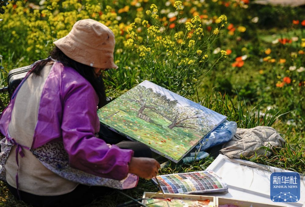↑ 3月10日,一名油画爱好者在昆明名花谷写生。