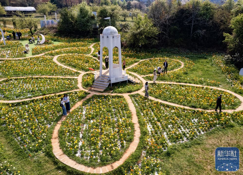 ↑ 3月10日,游客在昆明名花谷拍照打卡(无人机照片)。
