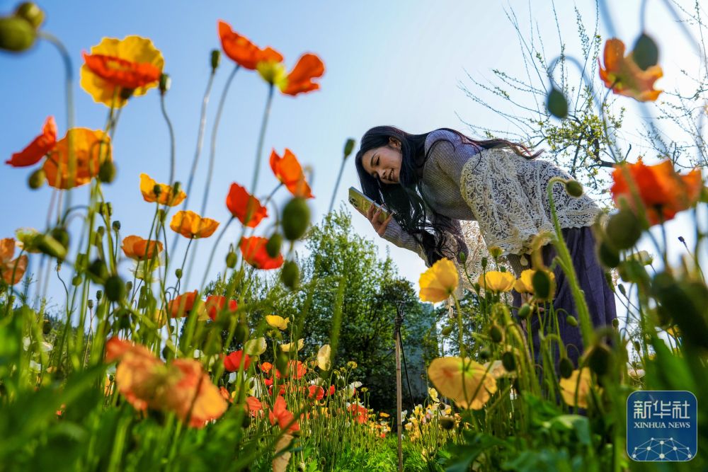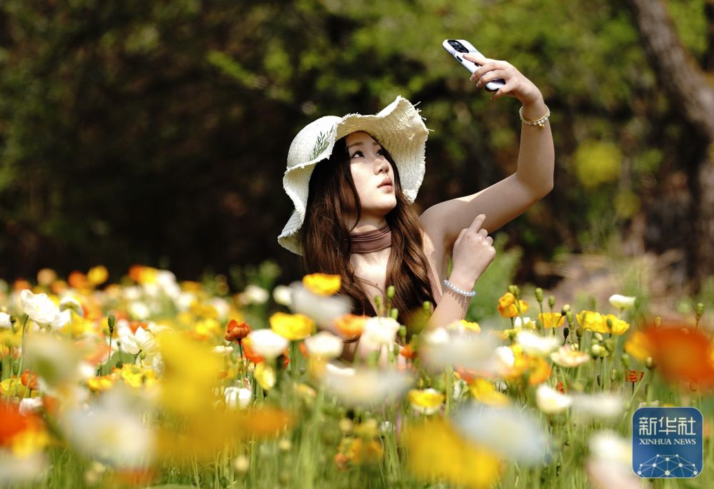 ↑ 3月10日,一名游客在昆明名花谷拍摄虞美人。
