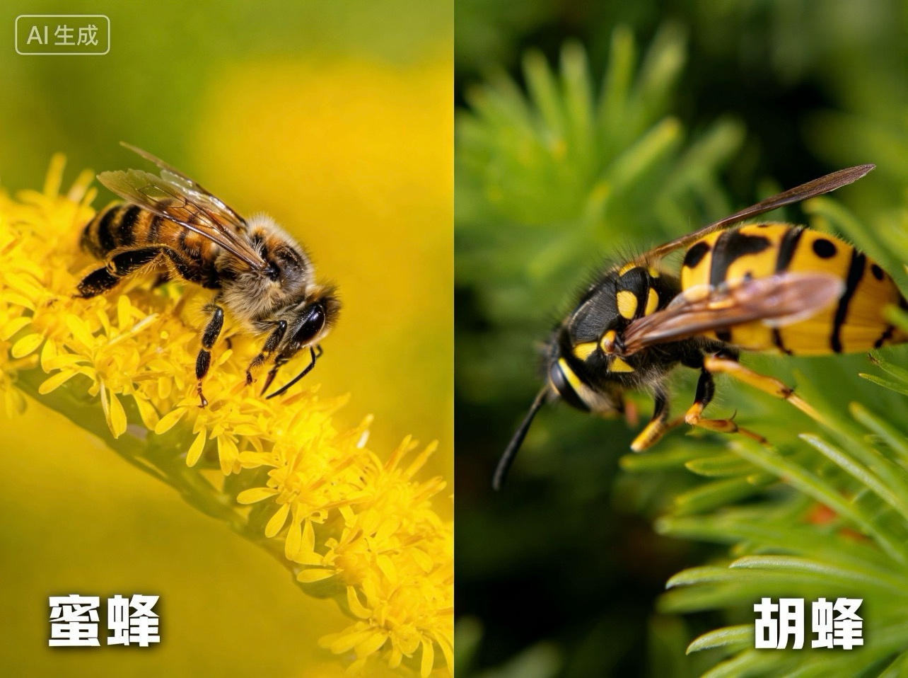 外观差异:胡蜂腰部明显,头部和身体表面光滑;蜜蜂则反之。