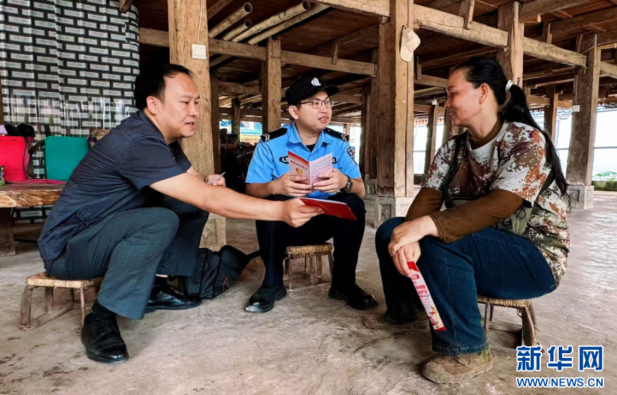 易君宇(左)进村开展普法宣传(2025年10月14日摄)。新华网发(董入榕 摄)