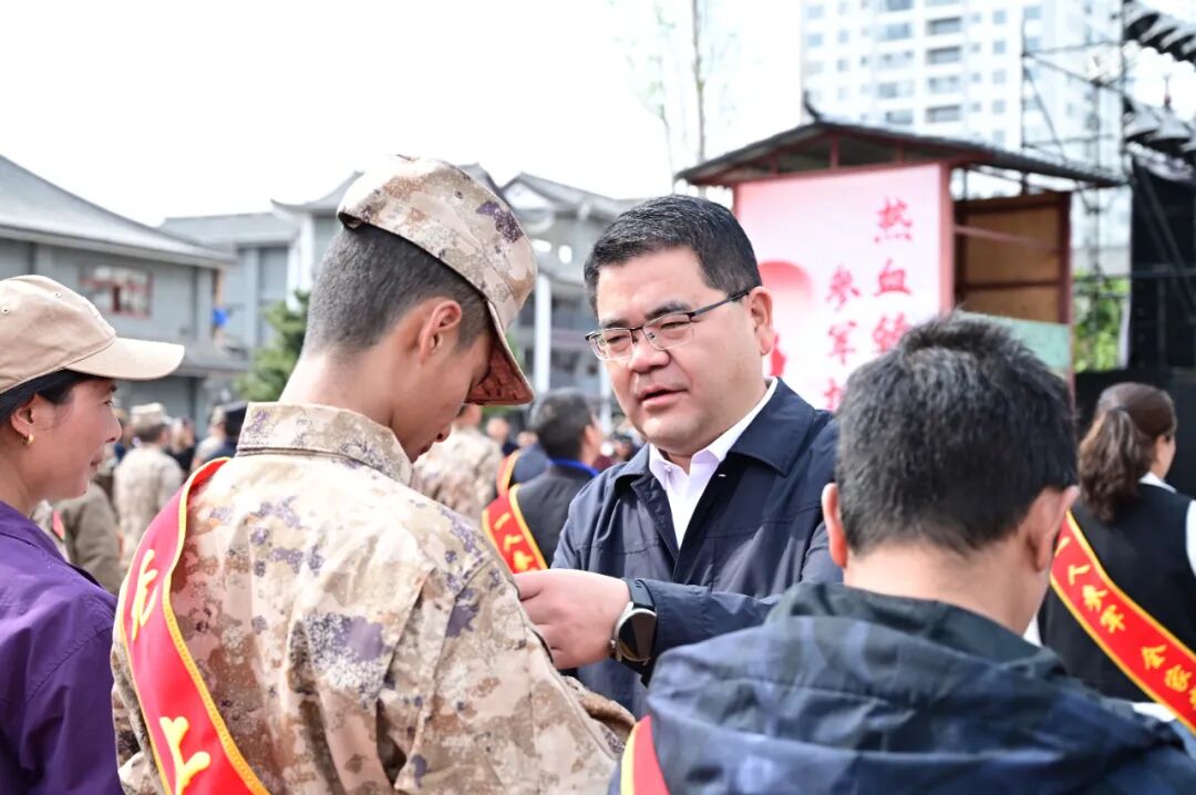 县领导施忠诚、钟毅、黄金、李加喜、王庆明、朱庆一为入伍新兵佩戴光荣花,并向全体新兵表示热烈祝贺,向积极送子参军、支持国防建设的军属们表示崇高的敬意。希望新兵们深入学习党的创新理论和习近平强军思想,始终把听党指挥作为最高政治原则,主动适应军营生活,刻苦锤炼军事技能,牢记自己是革命老区儿女,把家乡人民淳朴善良的品格、坚韧不拔的作风带到军营、融入战位,用过硬实绩为军旗添彩、为家乡争光。