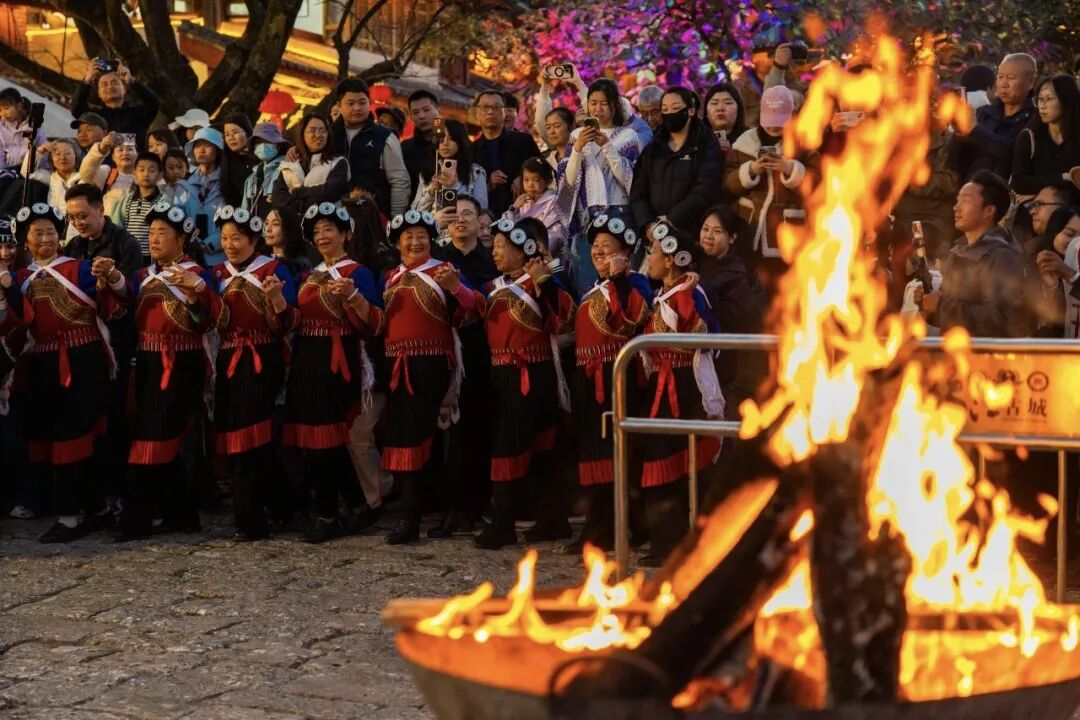 在丽江古城四方街,天南海北的游客和当地各族群众同歌共舞。(图源:“丽江古城景区”微信公众号)