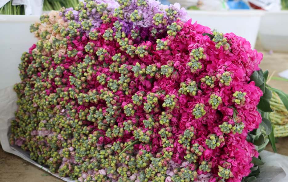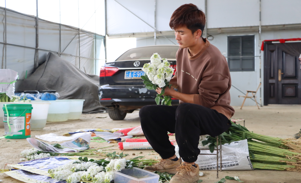 不远处的分装区,地面堆放着刚采摘回来的紫罗兰,花农们分工协作、有条不紊,将修剪好的紫罗兰按颜色分类、整齐码放,准备装车发往昆明斗南花市。阳光透过大棚顶洒在花农们脸上,汗珠折射出丰收的喜悦,指尖的花香也沾满了劳作的幸福。