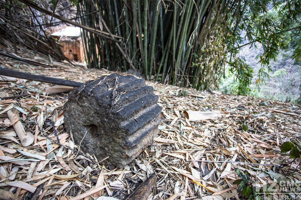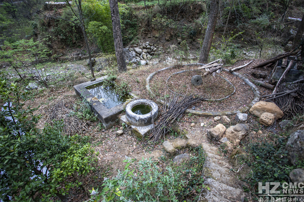 在老人的带领下,我们穿过茂密的竹林,来到崖壁之下的核心遗址。这里隐匿于竹林深处,鲜有人至,完整保留了原始风貌:一尊石碾居于中央,因常年使用与风吹日晒,表面呈现出深沉的褐色,棱角早已被岁月磨得光滑;石碾周围同样有砖石围成的碾槽,却已斑驳松动,落满了枯竹叶子;旁边的长方形水槽早已坍塌,只剩残垣断壁,尽显破败与沧桑。
