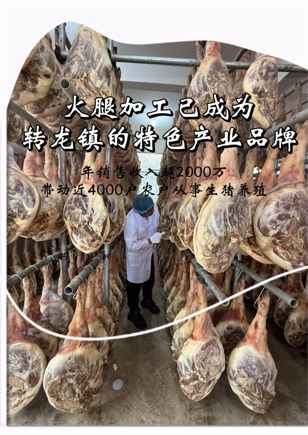 放眼整个转龙镇,生猪养殖已成为联农带农、促农增收的重要引擎。镇党委书记文琪介绍,通过大力发展资源经济,充分发挥土地、林下等资源优势,全镇成功打造了火腿加工、天麻、山泉水等特色品牌。仅火腿加工厂一项,年销售收入就超过2000万元,带动近4000户农户从事生猪养殖,其中大水井村500户中有300户参与,最大养殖户存栏量达1400至1500头。“通过发展产业,我们实现了家家户户有增收项目,有能力的选择创业,有劳动力的实现就业,形成了良好的增收机制。”文琪说。“十四五”期间,全镇通过土地流转支付给群众的资金突破1000万元,蔬菜种植总面积达7000亩,为群众创造了大量就地就近就业岗位,村民骑电单车就近打工,既能顾家又能增收。