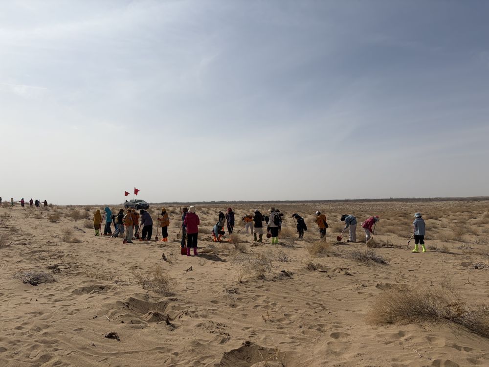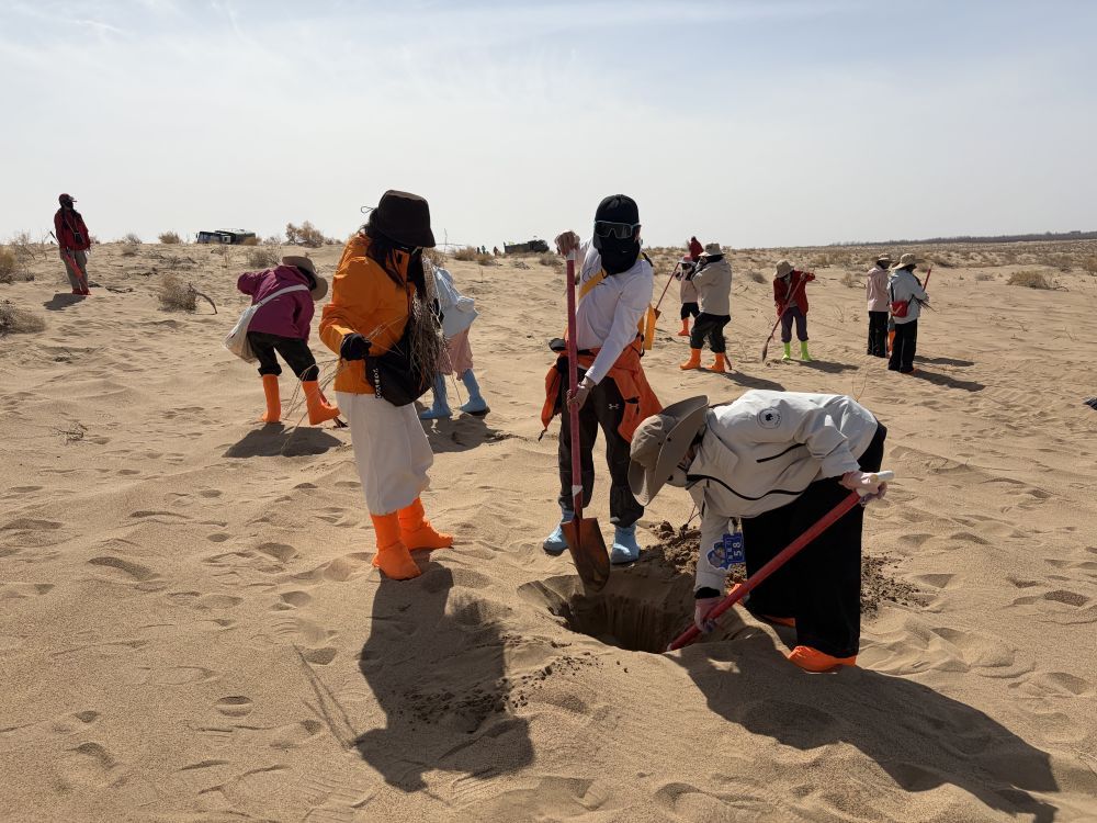 正在甘肃省兰州市一所高校学习中文的法国志愿者真理也参与了此次植绿活动,当中国朋友在沙漠中挖好坑后,她娴熟地种下一棵梭梭苗,再覆沙、浇水。