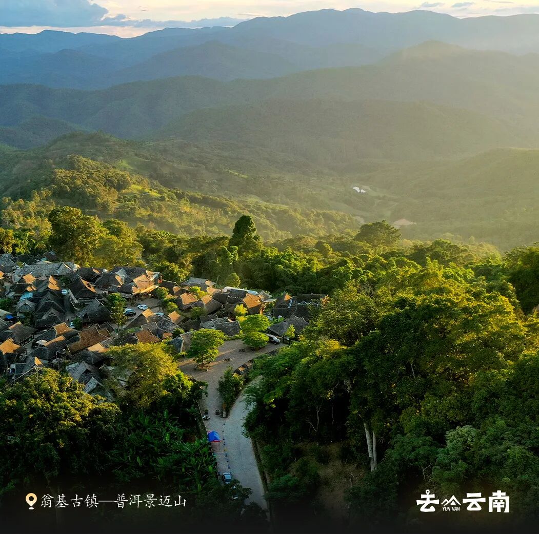 四月的景迈山,万亩古茶园在云雾中若隐若现,布朗族的翁基古寨与傣族的糯干古寨隔山相望。清晨,云海漫过屋顶,古茶林在金色的阳光中苏醒。