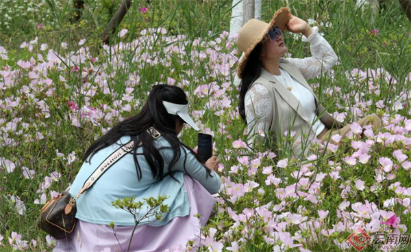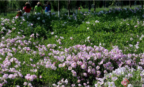 昆明滇池绿道月见草花盛开,让市民陶醉在明媚春光中。