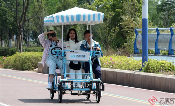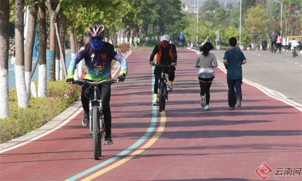 清明假日,春城市民在滇池绿道健身骑行,尽享休闲假日时光。