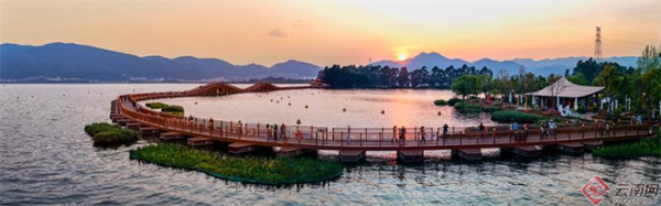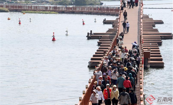 清明假日,在滇池草海畔,游人三五成群,或驻足拍照,或在开合浮桥凭栏远眺,陶醉在明媚春光中,绿道沿线月见草花竞相绽放,粉白相间的花朵连绵成片,与碧波荡漾的滇池相映成趣,吸引众多市民和游人前来踏青赏景。