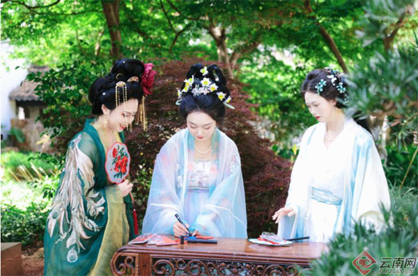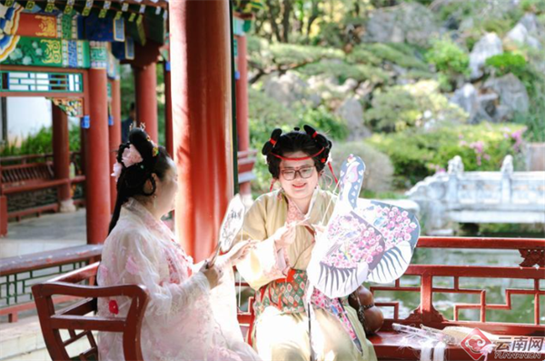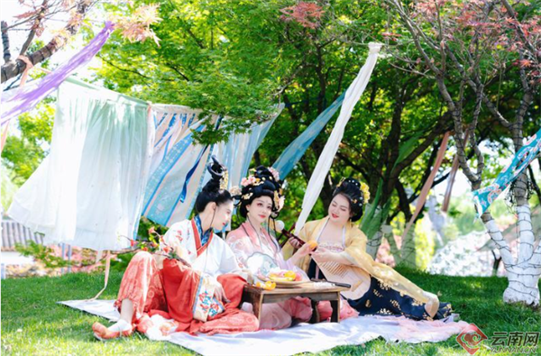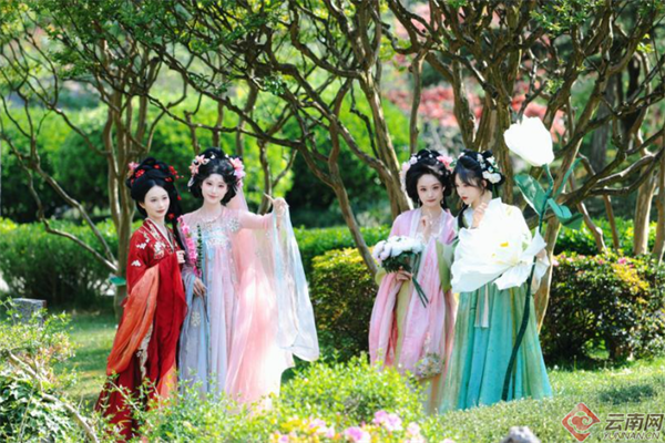 由汉服爱好者扮演的“十二花神”与“百花花神”在园内踏青赏景。