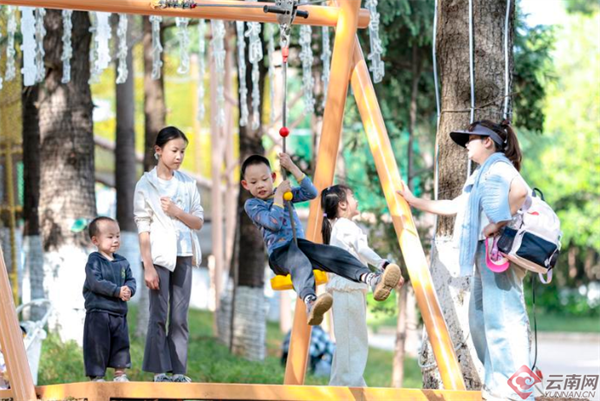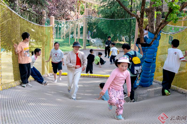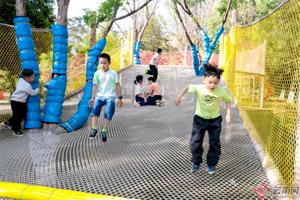 而与花神踏青的静谧雅致不同,园区“欢乐森林”区域则洋溢着欢声笑语。小朋友们化身“小小探险家”,在家长的陪伴下穿梭于林间索道与网绳攀爬架之间,在自然的课堂里尽情释放活力,体验户外运动的无穷乐趣。