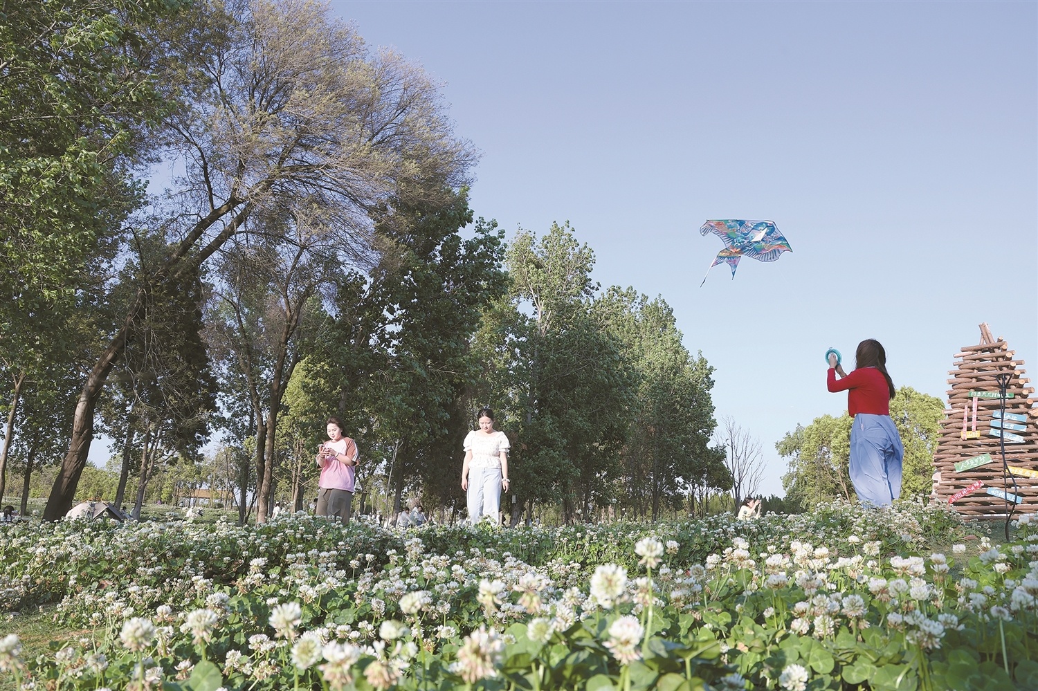 沿着绿道,人们有的走进附近村庄,搭帐篷露营、放风筝、野餐烧烤;有的徜徉于花海之中,拍照打卡,赴一场“与春天的约会”;有的停在路边的咖啡摊前,来一杯山茶花冷萃,体验鲜花饼手作,购买瓦猫、扎染玩偶等特色文创。(新华社记者 杨艳辉摄)