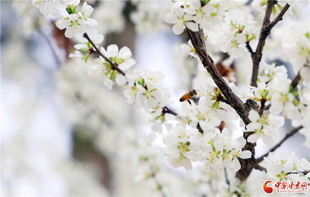 一只蜜蜂停驻花间,振翅采蜜,在纯白的花海中增添了灵动生机。各类春花次第开放,白的素雅、粉的娇嫩、红的热烈,为市民献上一场春日视觉盛宴。